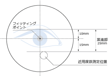 一般の遠近両用レンズが14mm位であるのに対し、25mmと累進帯を長く設定することで中間部~近用部の変化をゆるやかにし、シニアレンズにありがちなユレ・ユガミを低減。