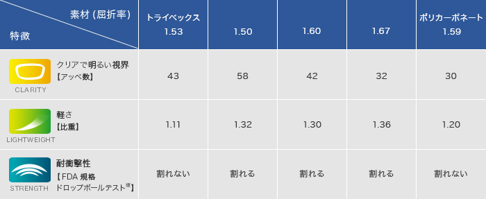 アメリカにおいて、眼鏡レンズの安全性・耐衝撃性は食品医薬品局(略称FDA=Food and Drug Administration)の規格で、『127cmの高さから16.2g の鋼球をレンズ面に自然に落下させるドロップボールテストで、レンズが破損しないこと』と規定されている。