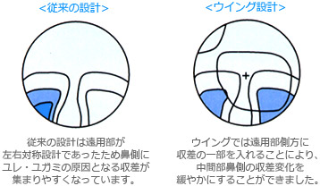 ウイングは、当社独自の累進設計に加え、全域非対称設計を取り入れたウイング設計を採用。従来の設計は遠用部が左右非対称であったため、鼻側にユレ・ユガミの原因となる収差が集まりやすくなっていました。